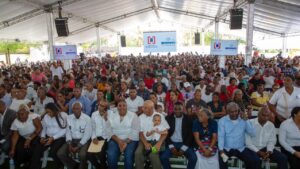 Durante su intervención, Abinader mencionó las obras de saneamiento y asfaltado del distrito municipal, señalando que su gestión concluyó la principal cañada de 2.6 kilómetros y que en dos meses se completará una segunda cañada, mientras gestiona fondos adicionales para concluir 300 metros lineales pendientes.