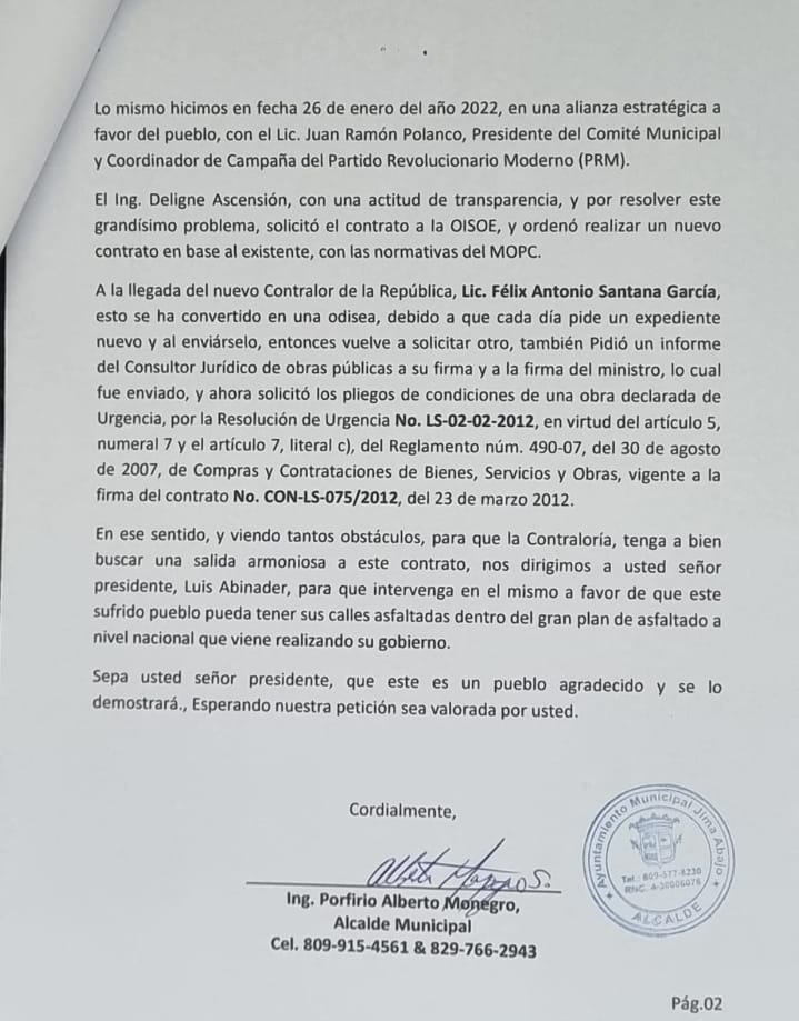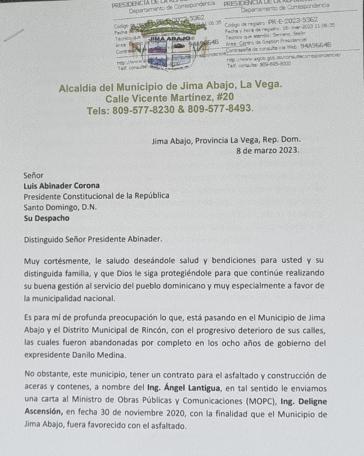 “Nos dirigimos a usted, señor presidente Luis Abinader, para que intervenga en el mismo a favor de que este sufrido pueblo pueda tener sus calles asfaltadas dentro del plan de asfaltado a nivel nacional que viene desarrollando su gobierno”, dice el funcionario municipal en una carta enviada al mandatario.