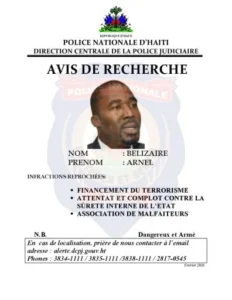 El ex alcalde de Puerto Príncipe fue detenido tras una orden de búsqueda emitida en su contra. Los delitos que se le imputan son «asesinato, tentativa de asesinato, destrucción de bienes públicos y privados y asociación para delinquir», se lee en el aviso de búsqueda publicado el lunes 8 de febrero en la página de Facebook de la PNH.