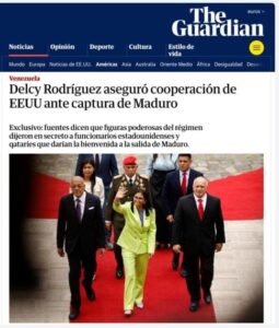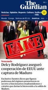 Caracas, RT.- El Gobierno de Venezuela calificó este jueves de noticia falsa un reporte del medio británico The Guardian, en el que se afirma que la presidenta encargada del país suramericano, Delcy Rodríguez, aseguró ya antes del secuestro del presidente Nicolás Maduro que cooperaría con EE.UU.