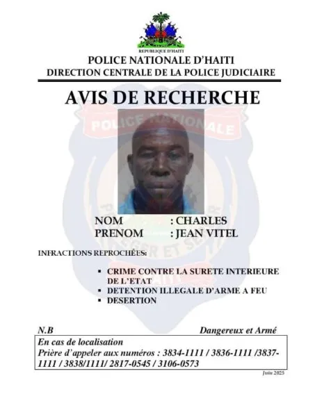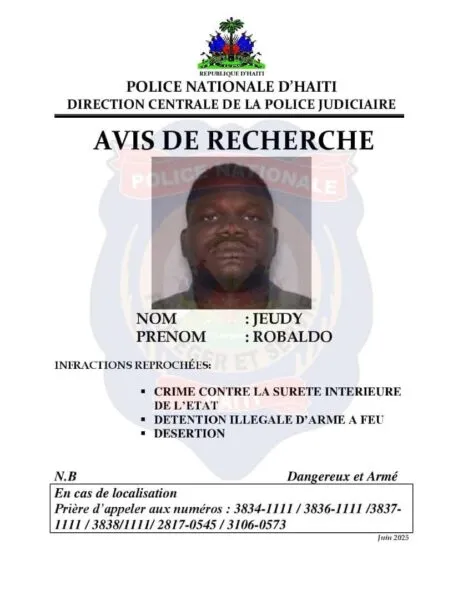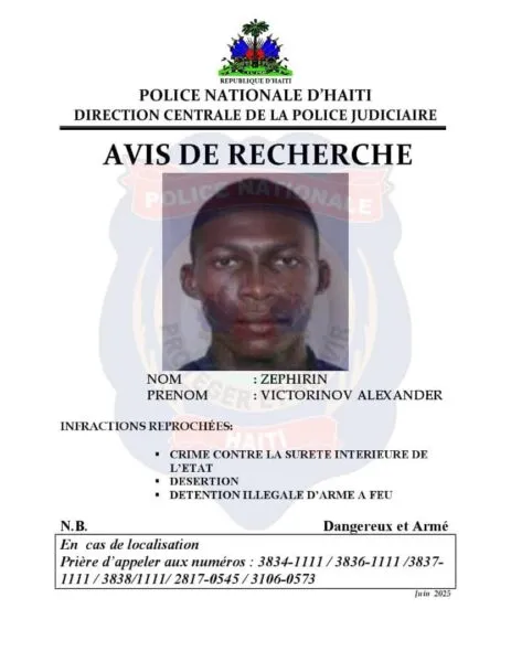 Tres soldados de las Fuerzas Armadas de Haití (FAD’H), que desertaron de la institución en posesión de un arsenal de armas y municiones, son buscados activamente por la Dirección Central de la Policía Judicial (DCPJ). Se trata de Jeudy Robaldo, Charles Jean Vitel y Zéphirin Victorinov Alexandre. Otras tres personas, presuntos asesinos, también son objeto de estas notificaciones de búsqueda.