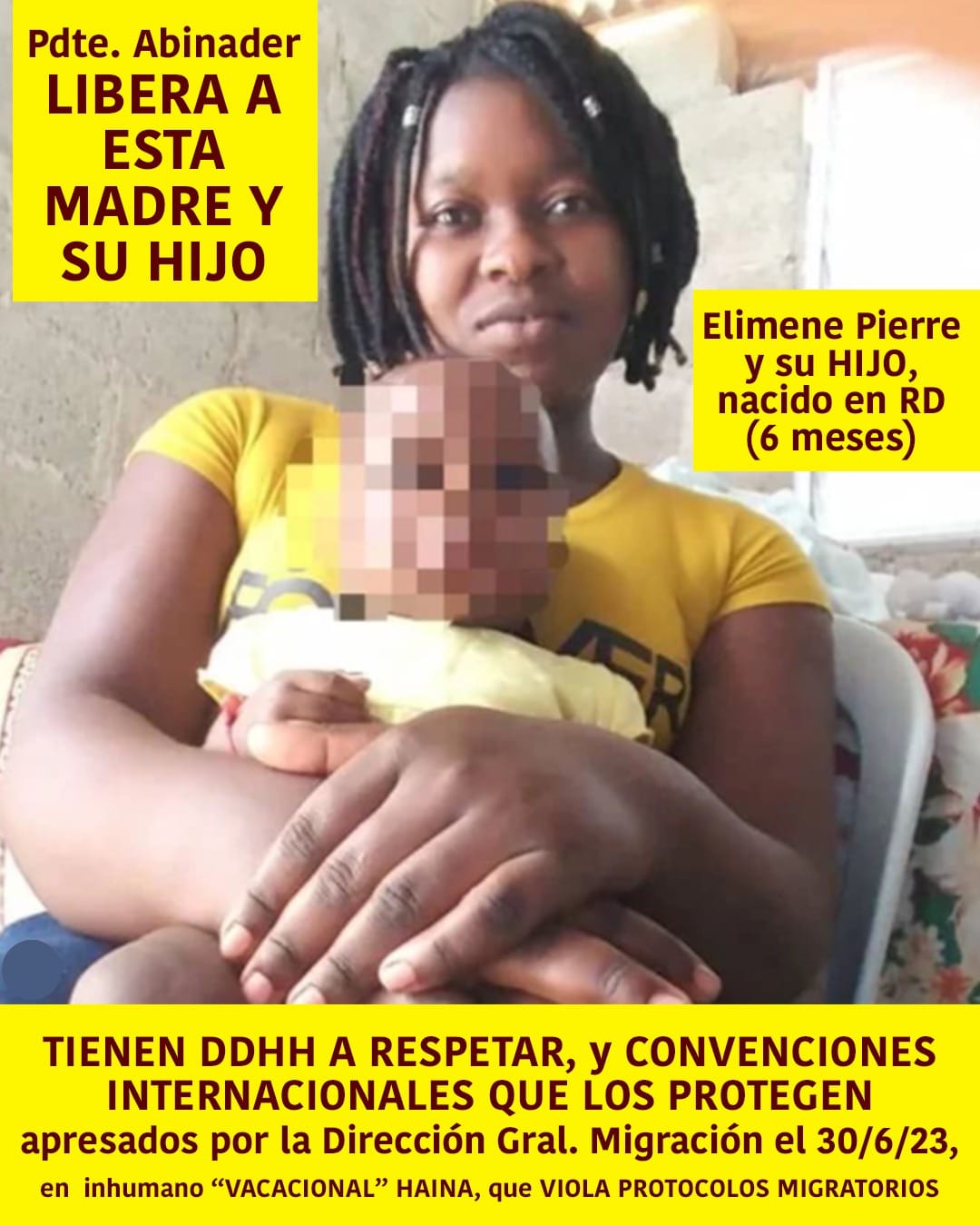 La joven señora Elimene Pierre, de 24 años, pasó la noche de viernes a sábado, 30 de junio-1 de julio de 2023, en la cárcel de la Dirección General de Migración (DGM) ubicada en Haina con su infante de seis meses en brazos. “Luego, ambos fueron deportados a Haití vía El Carrizal, Elías Piña”.