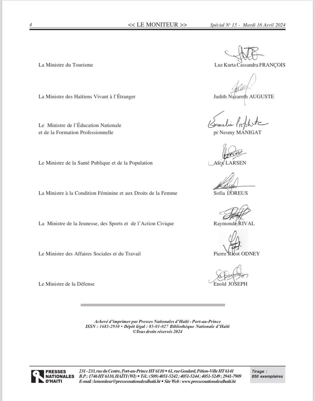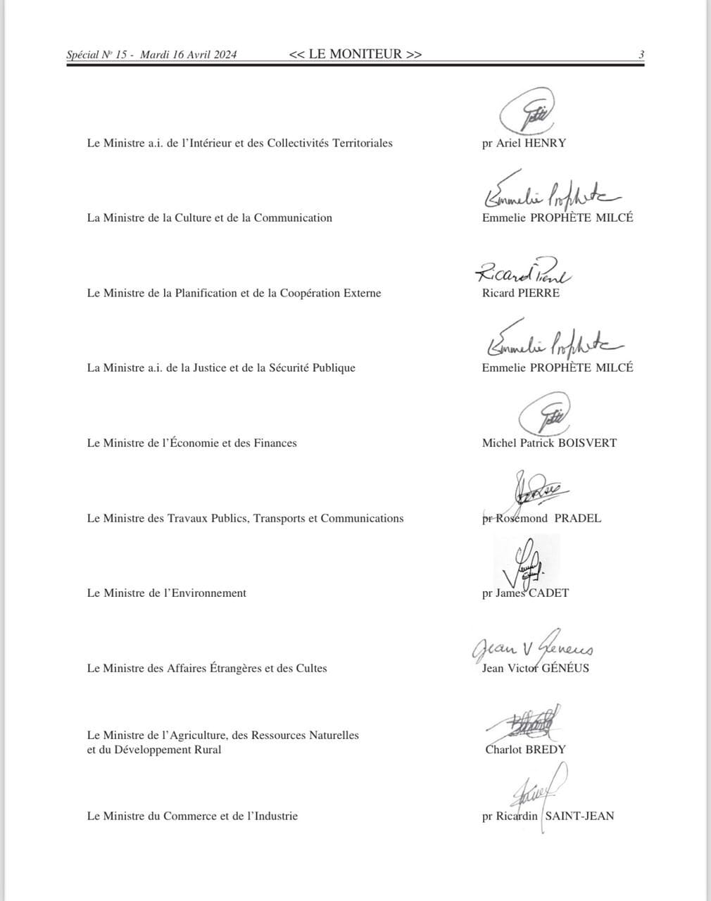El Gobierno de facto dimisionario publicó este martes 16 de abril de 2024, en el diario “Le Moniteur”, el decreto por el que se nombra a los 9 miembros del Consejo Presidencial. Según el documento que circula, la orden está firmada por el Primer Ministro de facto saliente Ariel Henry y todos sus ministros también de facto.