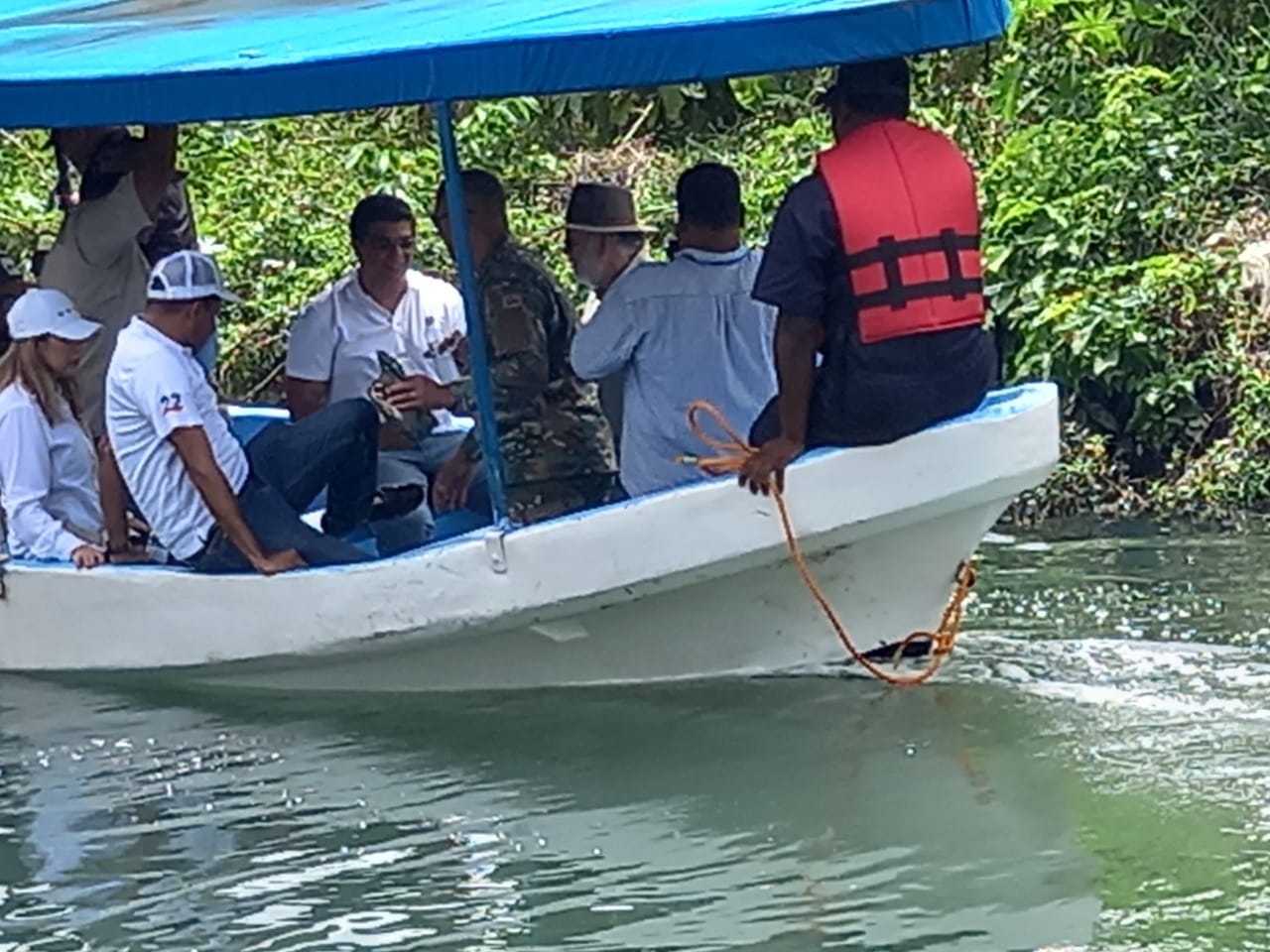 En una yola hacia la desembocadura de la cañada de Arroyo Hondo se dirigió un personal encabezado por el ministro de Medio Ambiente, Miguel Ceara Hatton, con sombrero (oculto, al lado del militar y al lado de Felipe Suberví, director de la Corporación del Acueducto de Santo Domingo (Caasd)