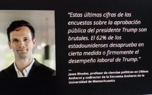 “En medio de un aumento vertiginoso de los precios, caídas significativas en el mercado de valores, una guerra impopular en Medio Oriente, un cierre del gobierno que ha provocado colas en los aeropuertos y protestas en todo el país contra su presidencia, no sorprende que los índices de aprobación del presidente Donald Trump se hayan visto afectados en nuestras últimas encuestas” Tatishe Nteta, dice el profesor rector de ciencias políticas de la UMass Amherst y director de la encuesta. “Lo sorprendente, y probablemente de grave preocupación para la Casa Blanca, son las caídas en el apoyo de los mismos grupos que ayudaron a Trump a recuperar la presidencia en 2024. Entre los hombres, los estadounidenses de clase trabajadora y los afroamericanos, los índices de aprobación de Trump han caído cerca de 20 puntos desde abril de 2025. También se observan caídas similares en el apoyo entre los moderados (18 puntos menos) y los independientes (13 puntos menos), distritos electorales clave en la victoria de Trump y en las próximas elecciones de mitad de período”