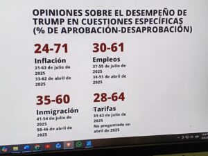 “Estas últimas cifras de las encuestas sobre la aprobación pública del presidente Trump son brutales”, dice Jesse Rodas, profesor de ciencias políticas en la UMass Amherst y codirector de la encuesta. “El 62% de los estadounidenses desaprueba en cierta medida o firmemente el desempeño laboral de Trump. ¿La razón? Los estadounidenses califican duramente a Trump por los problemas más destacados que enfrenta el país, especialmente por cuestiones económicas básicas. El setenta y uno por ciento dice que Trump no está manejando bien la inflación y el 61 por ciento dice que no está manejando bien el tema del empleo. Se suponía que los aranceles serían uno de los temas emblemáticos de Trump, pero son un desastre de relaciones públicas: casi dos de cada tres estadounidenses (64%) le dan una calificación negativa. Cuando se trata de la opinión pública, las preocupaciones económicas suelen dominar, y los estadounidenses’ tienen opiniones duramente negativas sobre el liderazgo económico de Trump y son una de las principales causas de la disminución de sus cifras en las encuestas”
