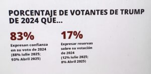 “Si bien la mayoría de los republicanos, y prácticamente todos los republicanos del MAGA, todavía apoyan a su hombre, hay algunas señales de erosión en el apoyo entre quienes lo devolvieron a la Casa Blanca”, dice Alejandro Teodoridis, profesor asociado de ciencias políticas en la UMass Amherst y codirector de la encuesta. “Desde que empezamos a preguntar a los votantes de Trump si se arrepienten de sus votos hace aproximadamente un año, el porcentaje que nos dice que todavía tienen ‘mucha confianza’ en su voto ha caído de aproximadamente tres cuartas partes (74%) a menos de dos tercios (62%). En total, 1 de cada 5 (21%) votantes de Trump nos dice que tiene algunas preocupaciones sobre su voto en 2024. El siete por ciento tiene sentimientos encontrados y 1 de cada 10 votantes de Trump nos dice que podrían o votarían de manera diferente o que no votarían en absoluto si tuvieran que hacerlo de nuevo.