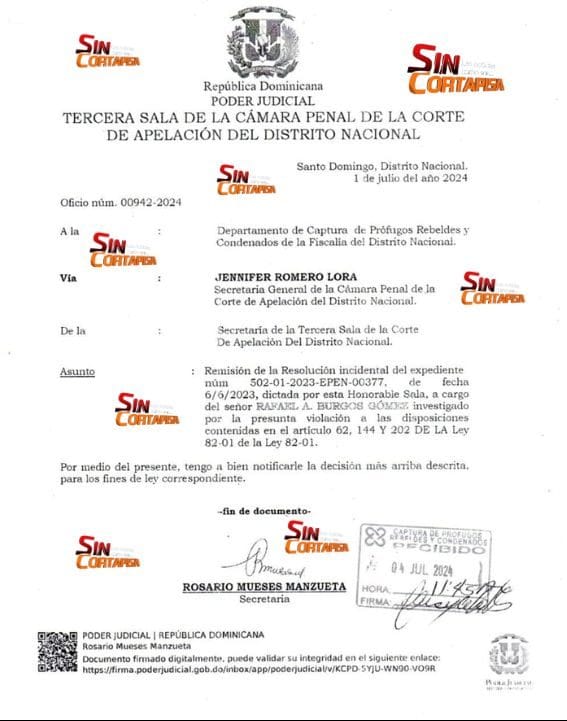Asimismo, se reitera una orden de detención al Departamento de Captura de Prófugos Rebeldes y Condenados de la Fiscalía del Distrito Nacional a fines de llevar a cabo de forma inmediata en contra del señor Burgos Gómez.
