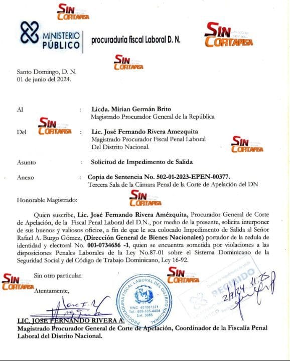 “Quien suscribe, Lic. José Fernando Rivera Amézquita, Procurador General de Corte de Apelación, de la Fiscal Penal Laboral del D.N., por medio de la presente, solicita interponer de sus buenos y valiosos oficios, a fin de que le sea colocado Impedimento de Salida al Señor Rafael A. Burgo Gómez, (Dirección General de Bienes Nacionales) portador de la cedula de identidad y electoral No. 001-0734656 -1, quien se encuentra sometida por violaciones a las disposiciones Penales Laborales de la Ley No.87-01 sobre el Sistema Dominicano de la Seguridad Social y del Código de Trabajo Dominicano, Ley 16-92”, cita la orden de impedimento de salida dirigida a la procuradora general de la República Miriam German Brito a finales del recién pasado mes de julio.