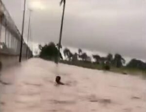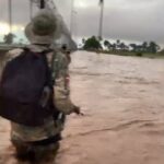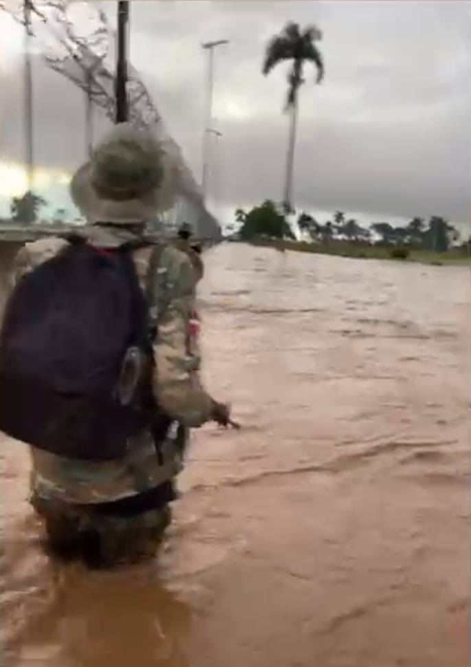 Las imagenes dan cuenta de varios militares que tuvieron que moverse nadando desde un puesto para buscar refugio en una las torres que funcionan como garitas a orilla del muro que divide esta parte de la frontera con el departamento de Juana Méndez Haiti.