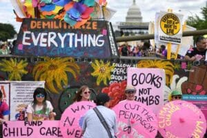 Los participantes llevaban carteles con mensajes como «hogares, no drones», «aplastemos juntos el capitalismo» y «todo el mundo tiene derecho a vivir», frases que reflejan la diversidad de preocupaciones de la sociedad que habita en la mayor economía del mundo.