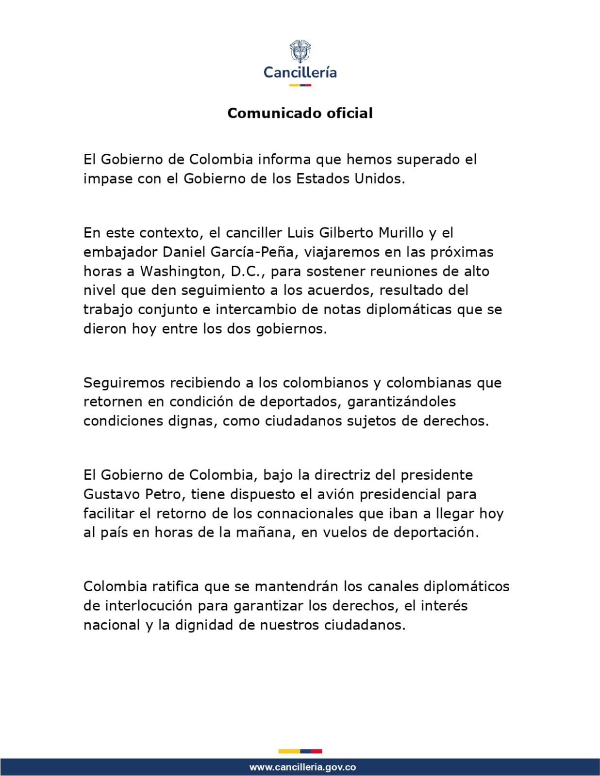 Luego de una retahíla de respuestas de Petro a muchos de los cuestionamientos, sorpresivamente a las 10:20 de la noche replicó un mensaje publicado por la asistente de la Secretaria de Prensa de la Casa Blanca, en el cual dice: “El Gobierno de Colombia ha aceptado todos los términos del presidente Trump” y anexa un comunicado de la Casa Blanca en el que dice que Petro aceptó que los aviones aterrizaran tal y como el presidente Trump lo había determinado y que por ello no se aplicarán las sanciones económicas. Que se mantendrán en “reserva y sin firma”, a no ser que Colombia no honre el acuerdo.
