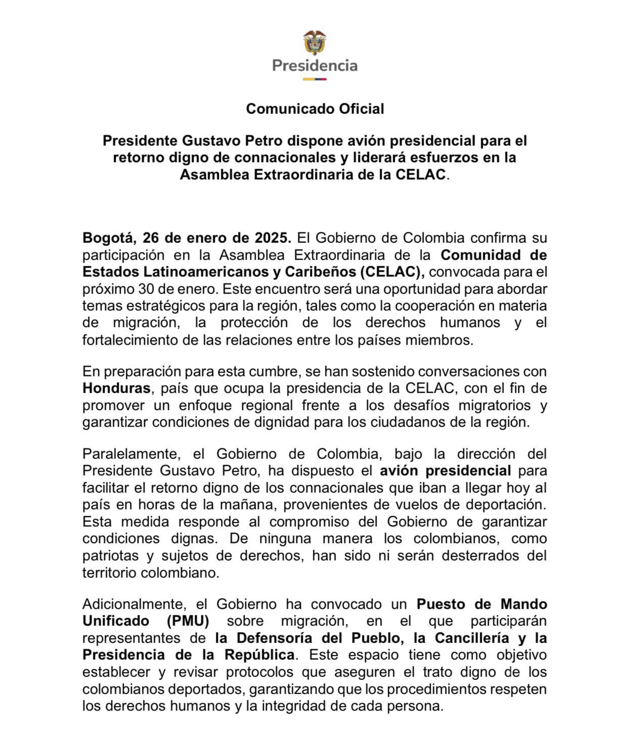 Pasada la 1:30 de la tarde, el mandatario colombiano volvió a trinar anunciando que dispondría del avión presidencial de Colombia para garantizar el retorno de los colombianos deportados, lo cual pareció más una respuesta a los cuestionamientos que le hicieron por el hecho de que al no dejar aterrizar los aviones le estaba negando la entrada a los colombianos a su propio país. Esa opción, de traer a los deportados en el avión presidencial, no es sostenible por costos y capacidad.
