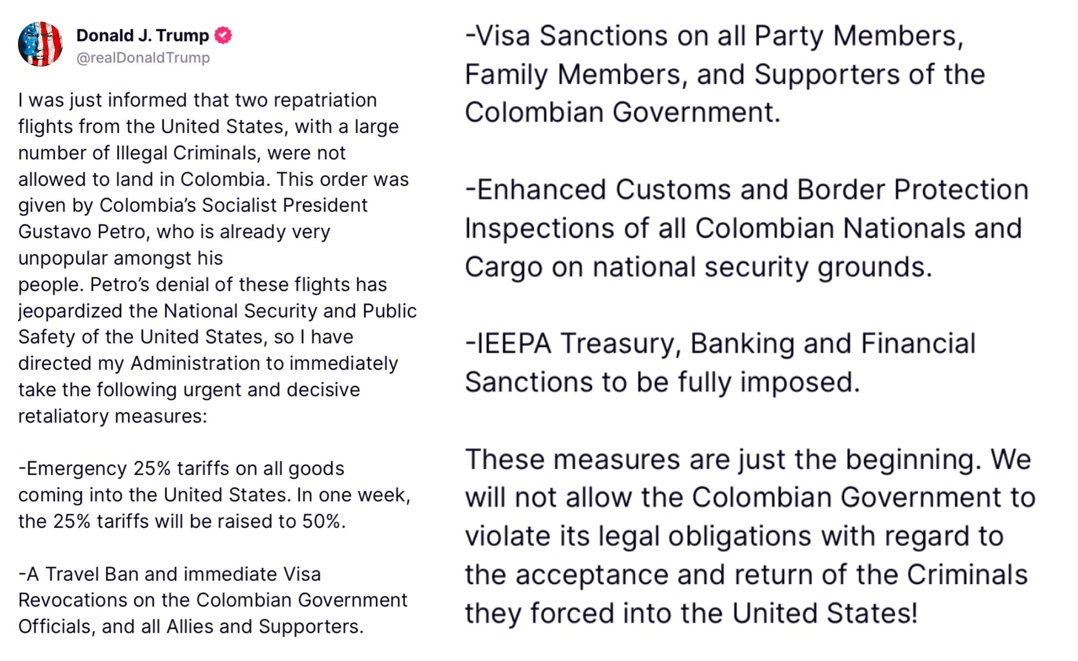 «Los EEUU no pueden tratar como delincuentes a los migrantes Colombianos. Desautorizo la entrada de aviones norteamericanos con migrantes colombianos a nuestro territorio. Desautorizo la entrada de aviones norteamericanos con migrantes colombianos a nuestro territorio. EEUU debe establecer un protocolo de tratamiento digno a los migrantes antes que los recibamos nosotros», Gustavo Petro, presidente colombiano, a las 4:41 a. m. del 26 ene, 2025