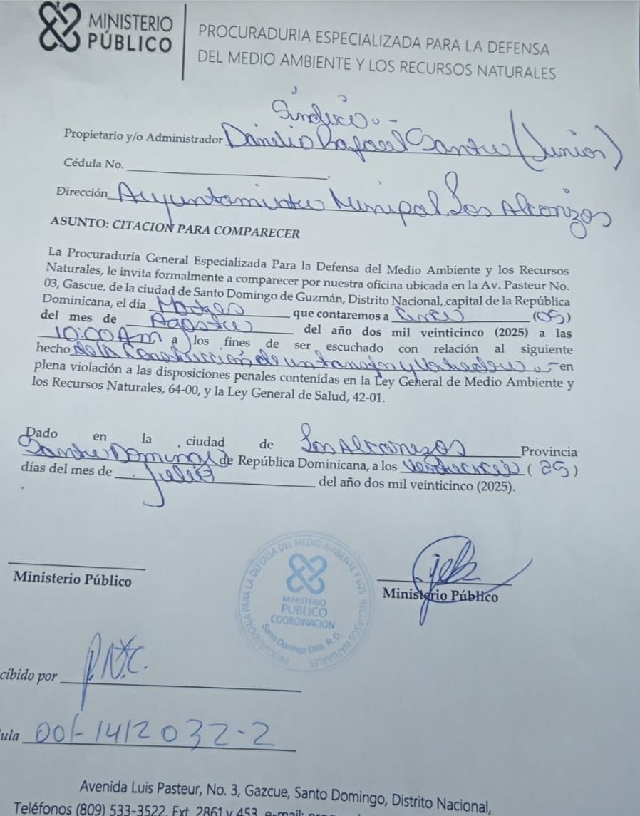 Además de su denuncia y de recibir la cita de la Fiscalía de Medio Ambiente dirigida a Santos, Núñez acompañó a esas autoridades del Ministerio Público en una visita al entorno del cementerio, donde mostró el lugar donde supuestamente existe un vertedero.