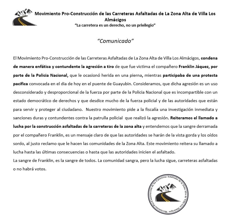 Un activista fue herido de bala en un muslo mientras participaba en la vigilia en el puente de Guayubín, en la autopista Duarte.