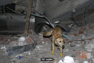 Malatya, AT.- Kopuk, un perro rescatista, se cortó en las cuatro patas con restos de vidrios mientras buscaba entre los escombros supervivientes de los terremotos en Turquía en la ciudad de Malatya.