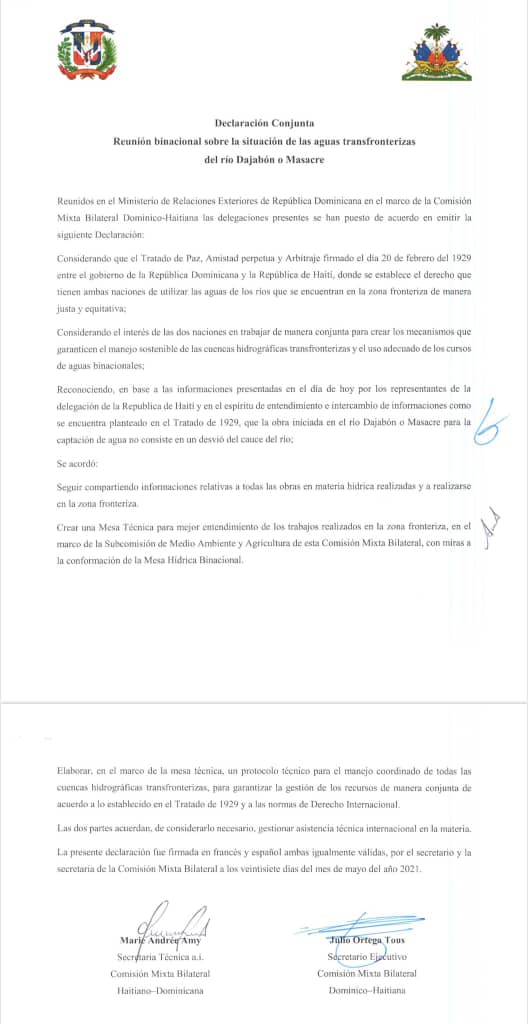 Santo Domingo.- República Dominicana aceptó conjuntamente con Haití la gestión de asistencia técnica internacional para manejar las cuencas hidrográficas transfronterizas en sentido general y de manera específica en el controvertido tema de la construcción de un canal que se abastecería de las aguas del río Masacre, según estipula un documento firmado por ambas naciones.