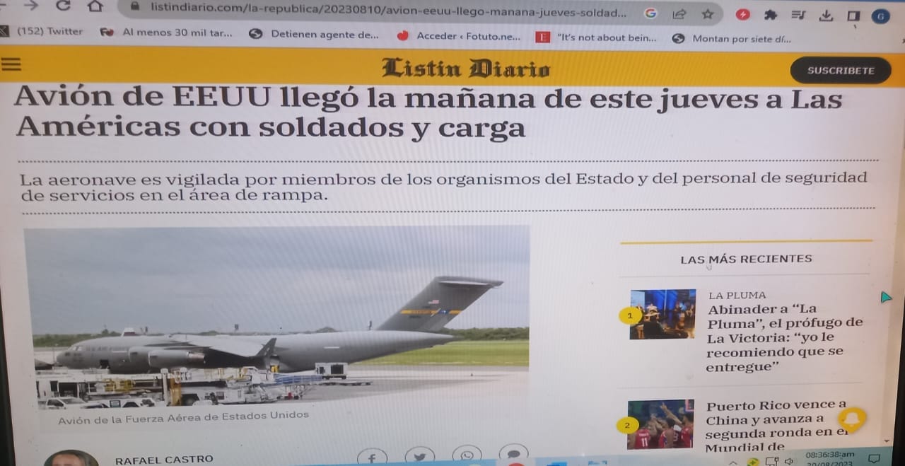 Un avión de la Fuerza Aérea de Estados Unidos llegó la mañana de este jueves al país por el Aeropuerto Internacional de Las Américas José Francisco Peña Gómez, procedente de Alemania, con soldados estadounidenses y carga, sin que haya trascendido el motivo de la visita, publicó el periódico Listín Diario el pasado día diez de agosto de 2023.