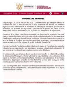 El Gobierno de Guerrero informó que realiza un operativo para ubicar y detener a los responsables del asesinato de Conrado Mendoza Almeda, alcalde de San Miguel Totolapan. También detalló que la Sedena desplegó unidades terrestres y aéreas para vigilar la zona.